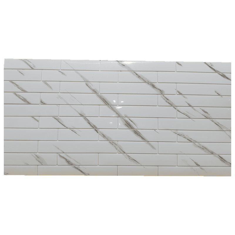 Moderniza tus ambientes con el Adhesivo Ladrillo 3D YX-10, un revestimiento con diseño tipo mármol blanco con vetas grises diagonales que aporta un estilo limpio, elegante y contemporáneo a tus espacios interiores.