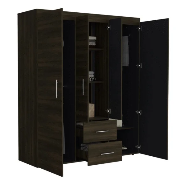 Amplio espacio interno con secciones para colgar y doblar prendas.