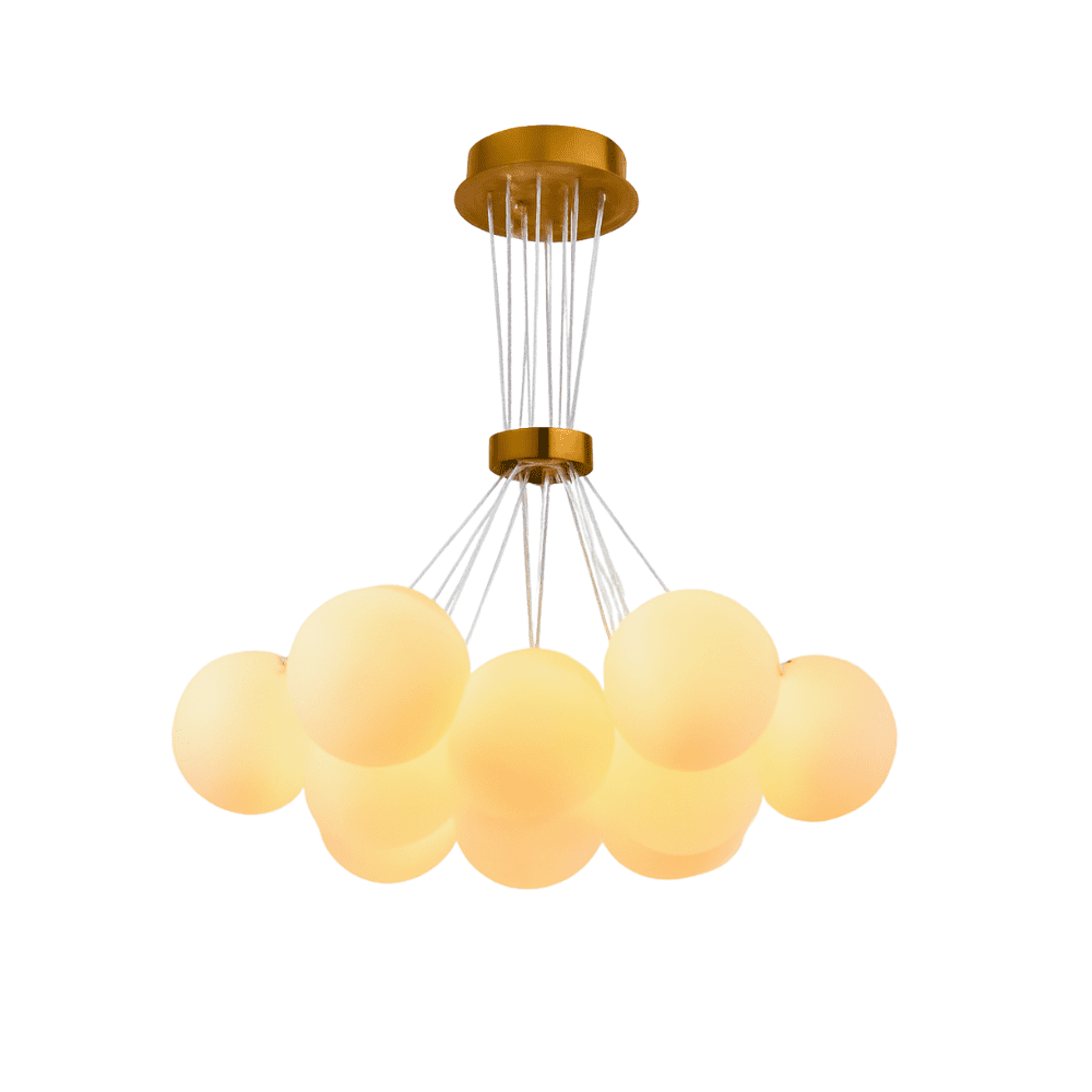 Transforma tu espacio con la lámpara colgante E27*10 + Blanco. Con un diseño contemporáneo y esferas de 12 cm de diámetro, esta lámpara aporta estilo y luminosidad a cualquier habitación. Su estructura metálica en tono dorado y cables delicados ofrecen un toque de sofisticación. Ideal para interiores modernos, salas de estar, comedores o dormitorios.