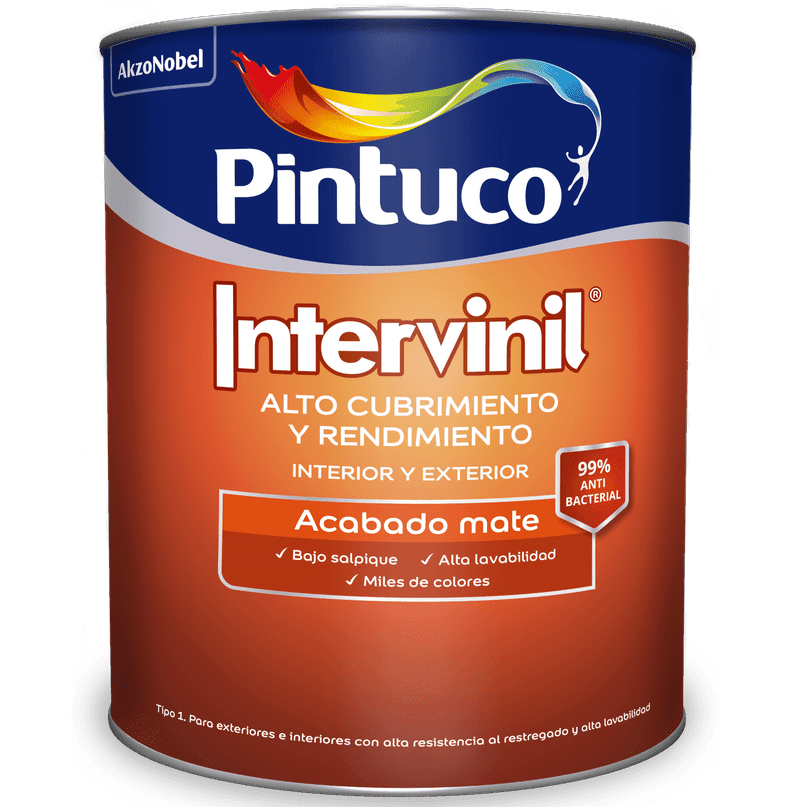 Intervinil Antibacterial base Mate es una pintura en emulsión base agua (látex), fabricada a base de copolímeros acrílicos de acabado mate y terso. Alto rendimiento y cubrimiento, ideal para ambientes interiores y exteriores. Máxima lavabilidad, fácil de aplicar. Intervinil® Anti bacterial contiene un ingrediente activo que elimina y evita la proliferación de bacterias, hongos y gérmenes en más de un 99% y su efecto anti bacterial no se pierde al limpiar las paredes. Disponible en colores directos y en el Sistema Colores Pintuco®.