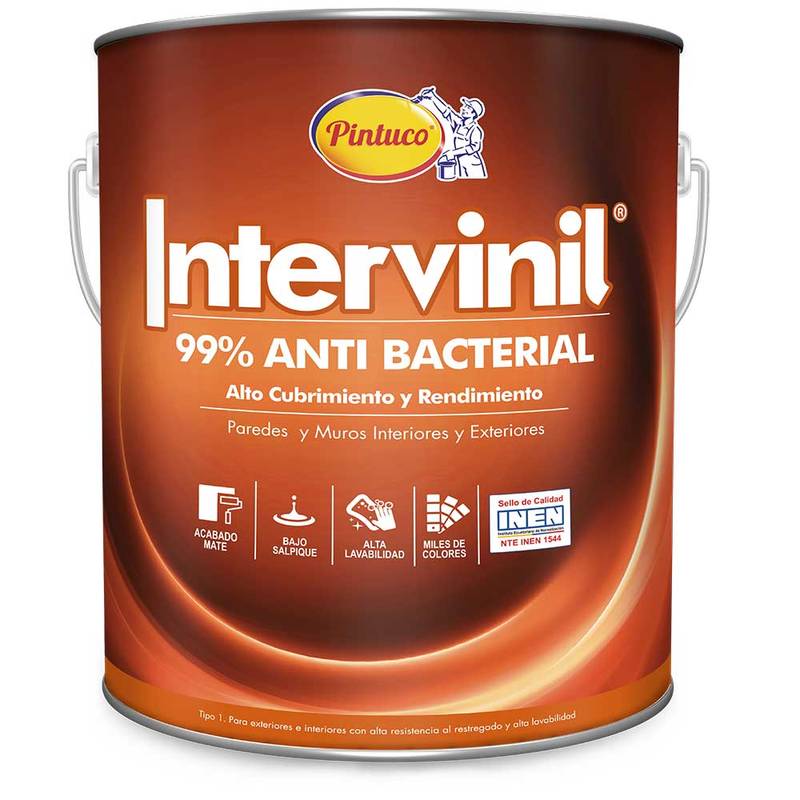 Intervinil Antibacterial es una pintura en emulsión base agua (látex), fabricada a base de copolímeros acrílicos de acabado mate y terso. Alto rendimiento y cubrimiento, ideal para ambientes interiores y exteriores. Máxima lavabilidad, fácil de aplicar. Intervinil® Anti bacterial contiene un ingrediente activo que elimina y evita la proliferación de bacterias, hongos y gérmenes en más de un 99% y su efecto anti bacterial no se pierde al limpiar las paredes. Disponible en colores directos y en el Sistema Colores Pintuco®.